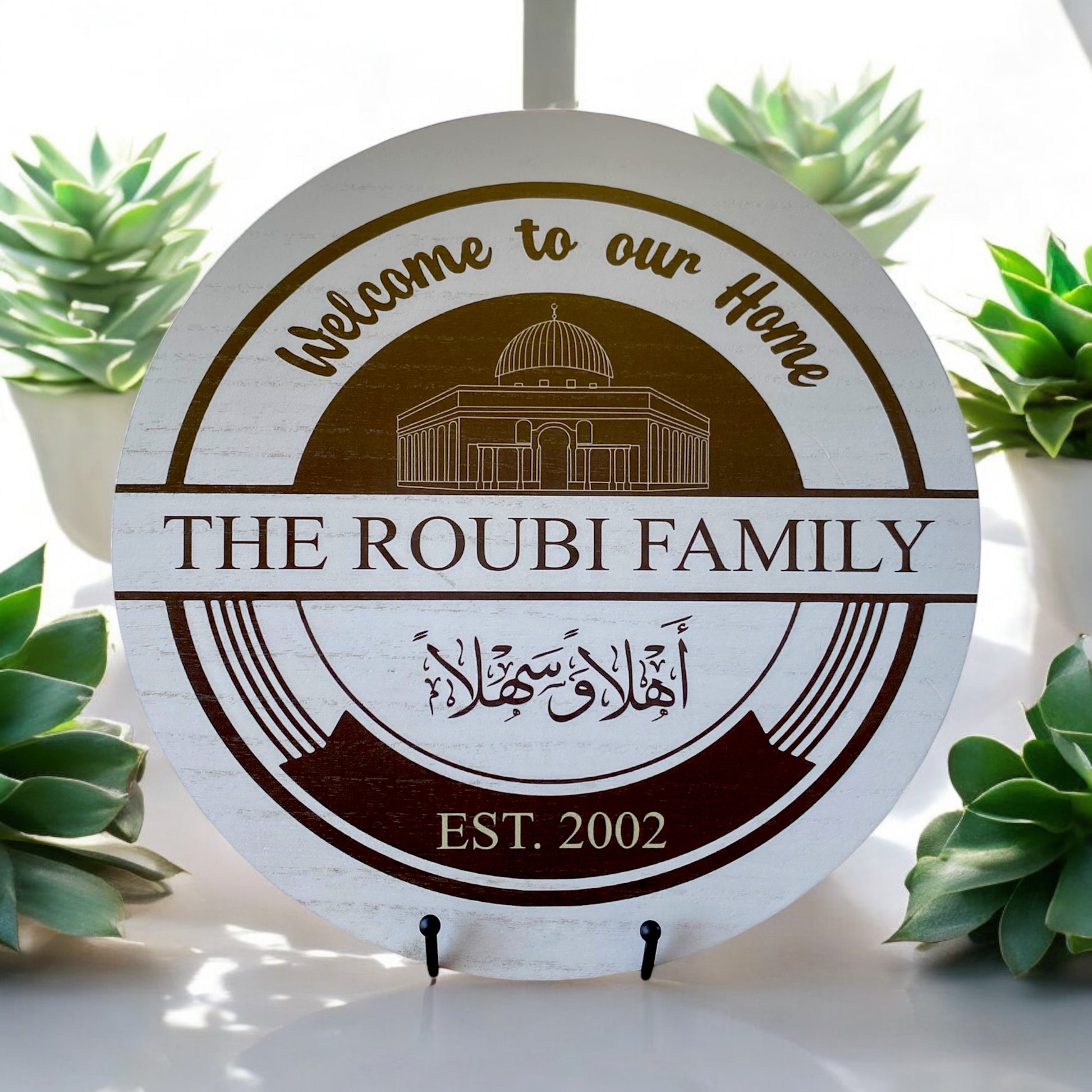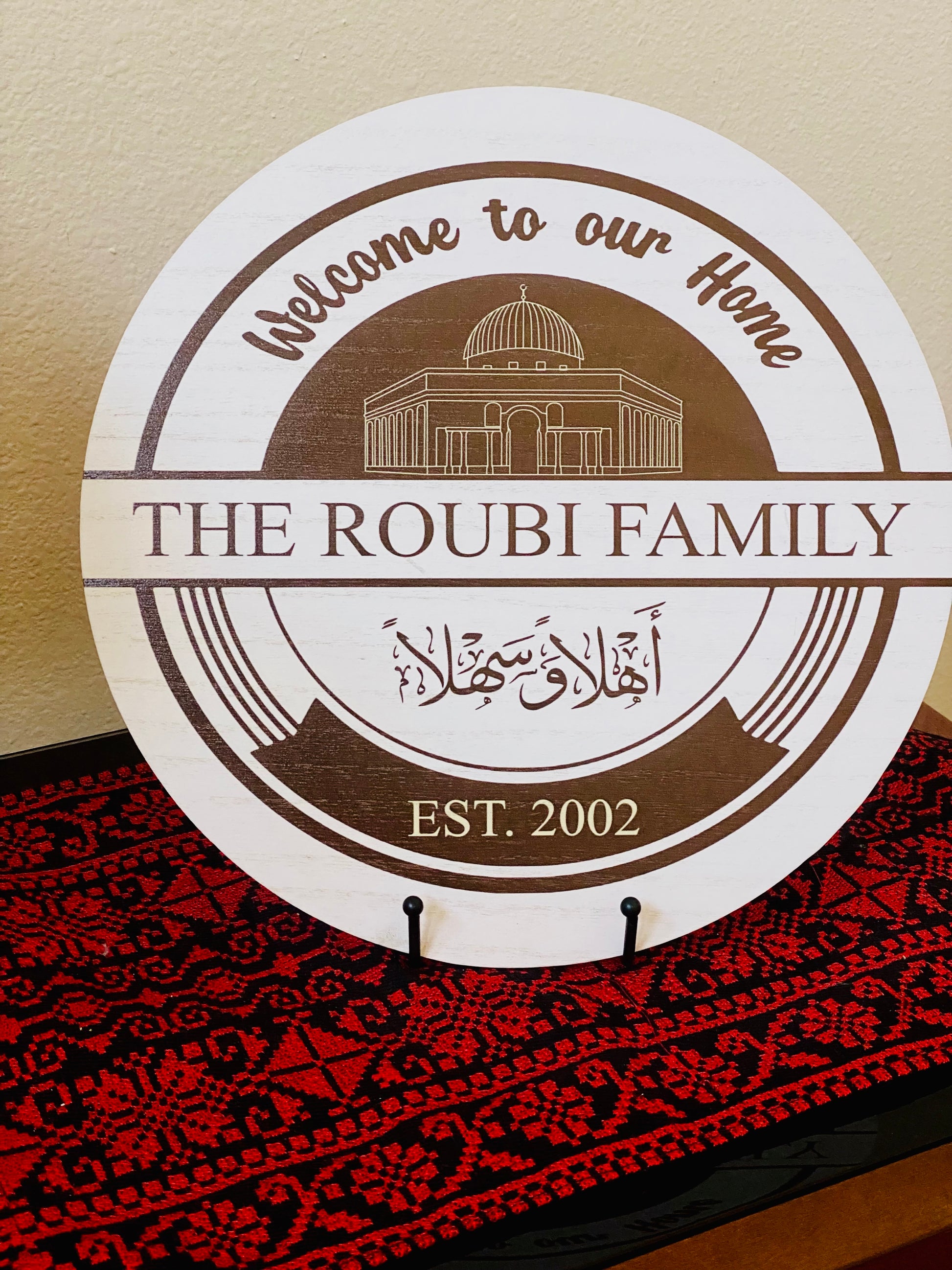 Celebrate the warmth of family and heritage with the Al Bayt Round Family Sign. This 12-inch personalized wooden sign features your family name, an elegant touch of your family’s established date, and the welcoming Arabic phrase “Ahlan wa Sahlan” (أهلاً وسهلاً), creating an inviting and heartfelt atmosphere for any home. Handcrafted from high-quality wood, this beautiful sign adds a personalized touch to your entryway, living room, or front door, making it the perfect keepsake for families. Whether as a thoughtful gift or a timeless decoration, the Al Bayt Round Family Sign is a stunning tribute to the strength and unity of your family.