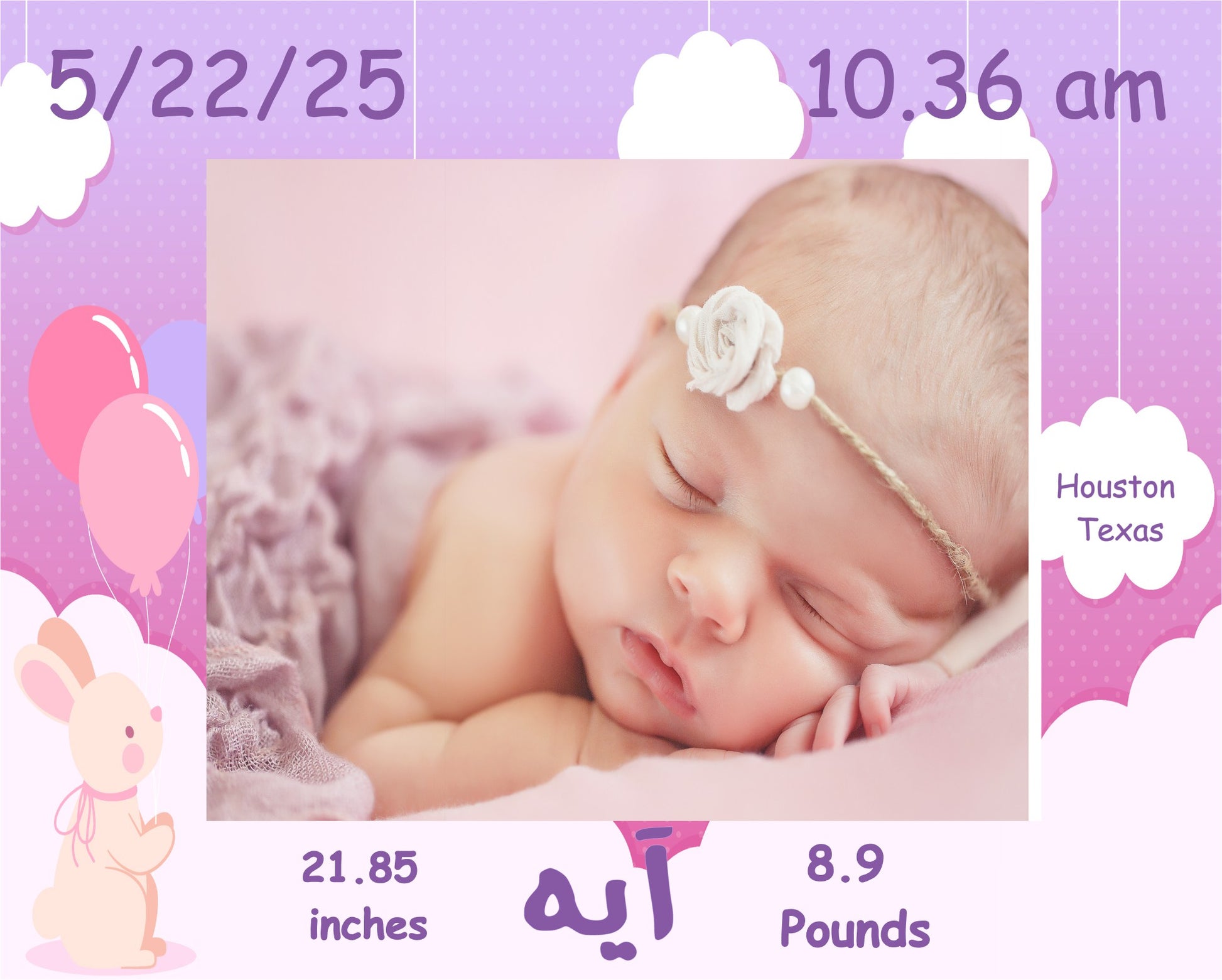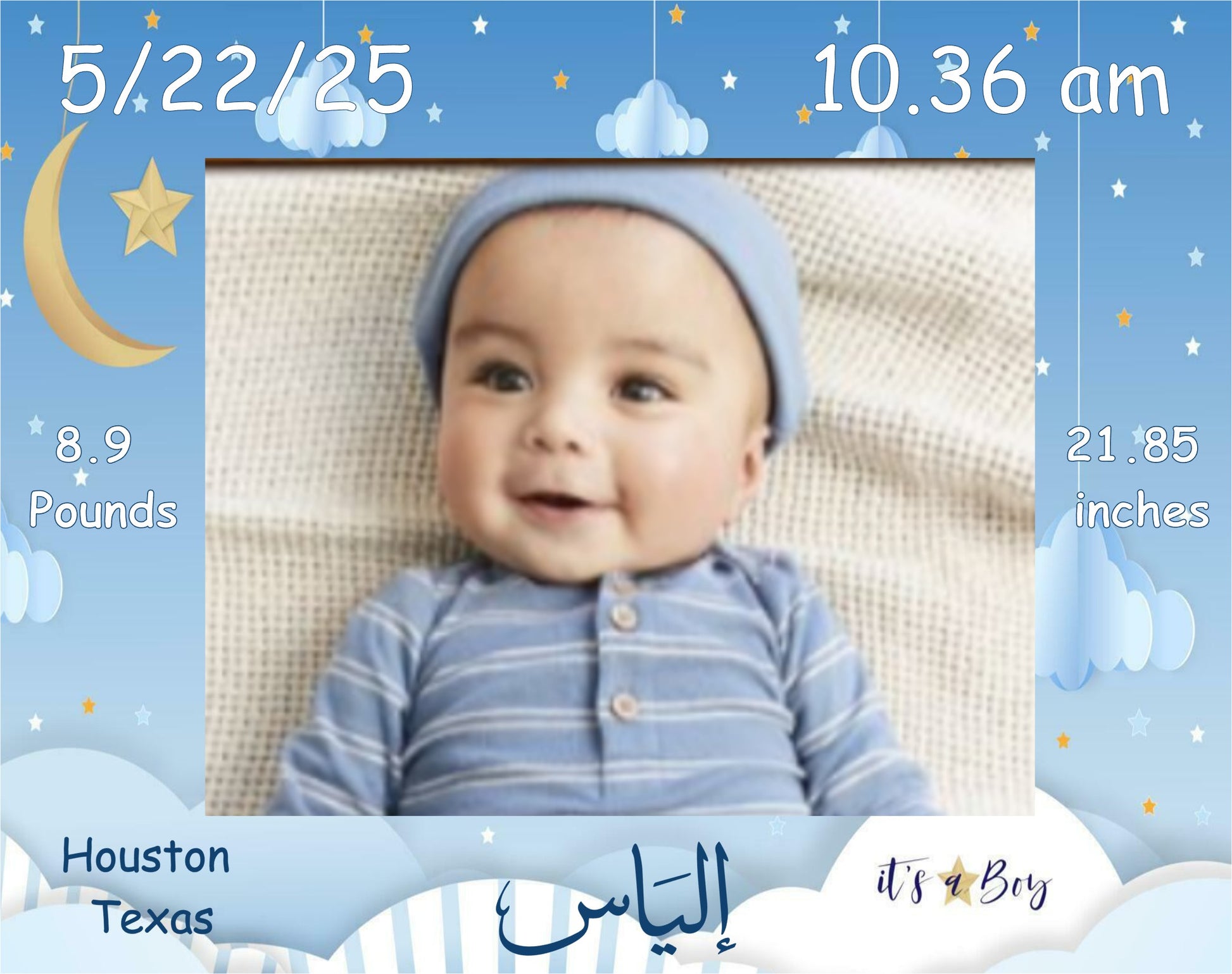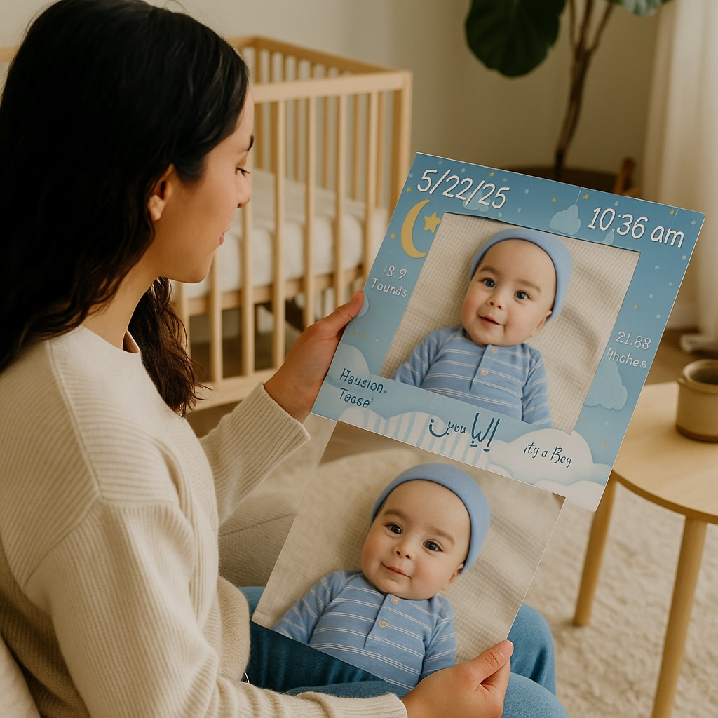 Cherish your baby's first memories with our Baby Keepsake Border – a custom-designed padding that adds a personal, heartfelt touch to your favorite photo. Made from sturdy, lightweight cardboard, this decorative border is printed with your baby’s name in English or Arabic, along with their birth details including date, time, weight, and length.