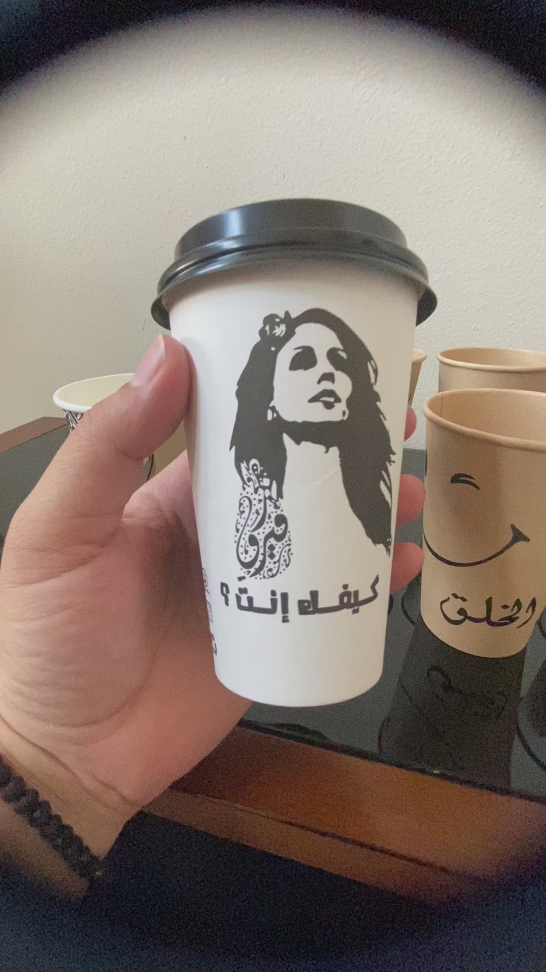 Celebrate the timeless legacy of the greatest singer in the Arab world with our Fayrouz-Inspired Paper Coffee Cups. Each 12-ounce cup in this set of 20 is adorned with beautifully printed Arabic phrases and quotes inspired by the iconic lyrics and sentiments of Fayrouz, bringing a touch of her artistry to your daily coffee ritual.
