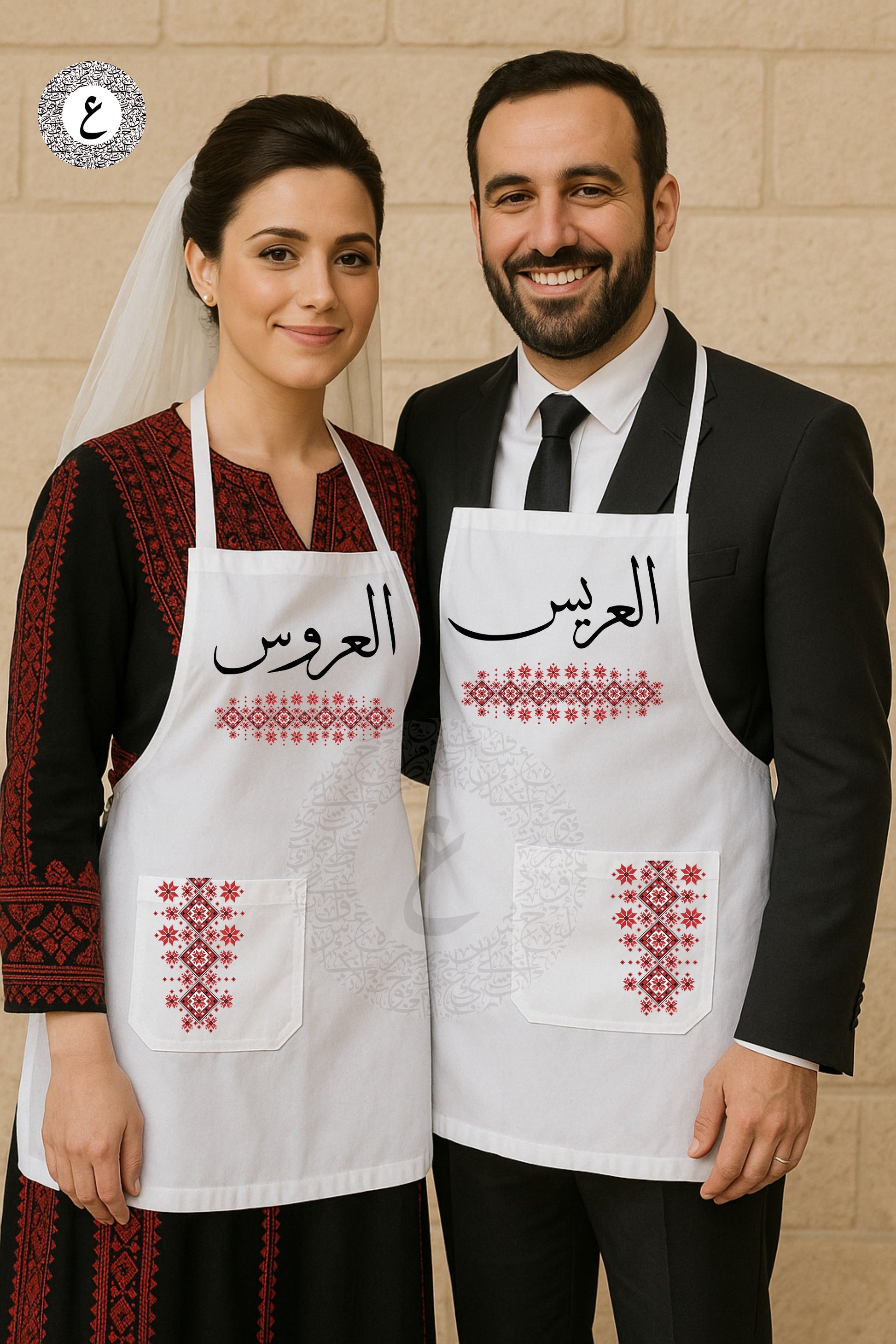 Celebrate heritage and love with these elegant white wedding aprons, inspired by traditional Palestinian weddings. Perfect for pre-wedding rituals, family gatherings, or as a cultural keepsake, these aprons feature the word "عريس" (Groom) or "عروس" (Bride) beautifully printed in tatreez embroidery style for an authentic and artistic touch.