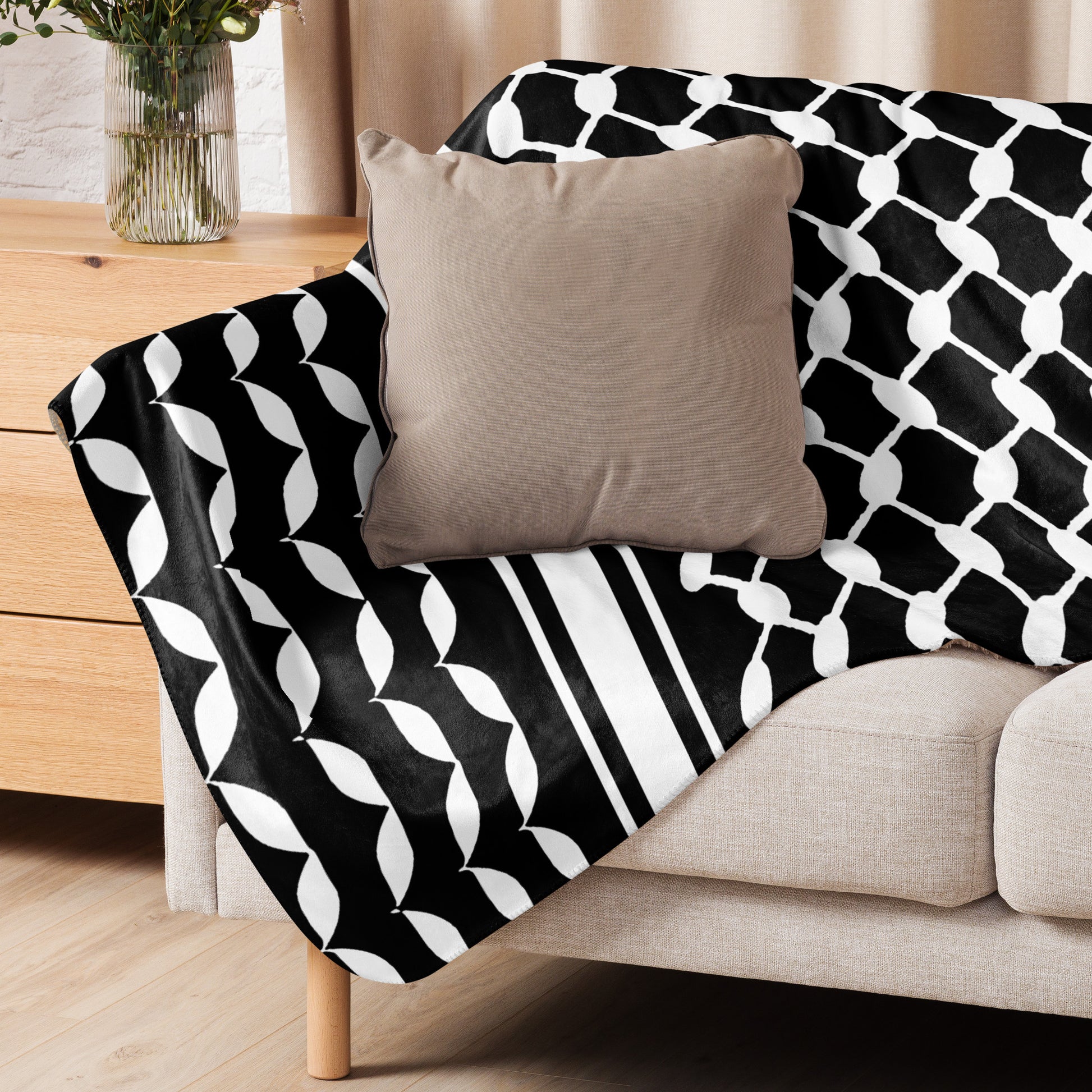Featuring the classic Kufiyah pattern, known for its distinctive geometric and arabesque motifs, this blanket is a blend of tradition and modern style. The bold black and white design, synonymous with Palestinian culture, adds a touch of elegance and significance to your space.
