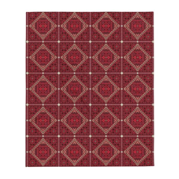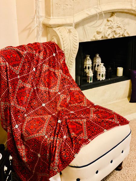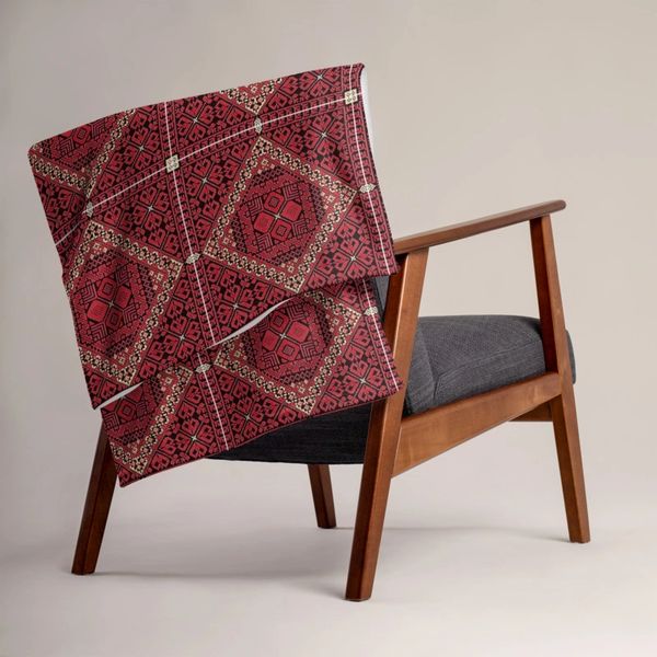 "Introducing our Palestinian Style Throw Blanket, a luxurious fusion of traditional artistry and modern comfort. Crafted with precision, this blanket features the iconic Kufia pattern interwoven with time-honored Palestinian embroidery motifs. It serves as a tactile and visual delight that extends beyond mere utility to become a statement piece in any living space.