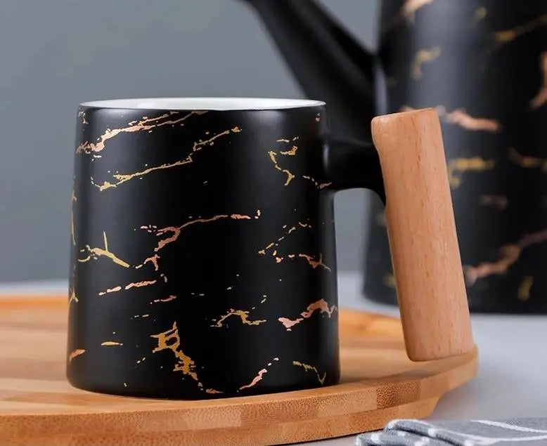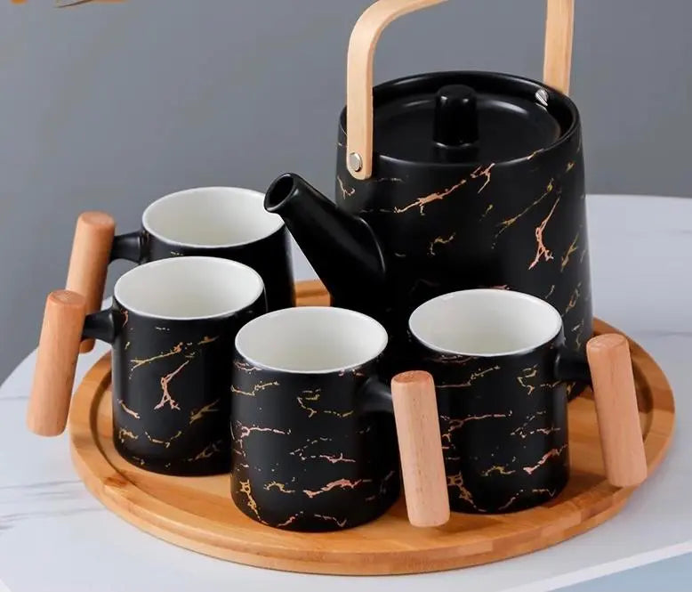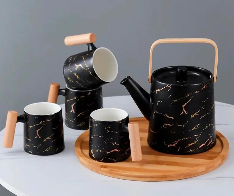 Accompanying the mugs is a stunning ceramic tea pot with a chic black finish, accentuated by a sleek wooden handle that adds a touch of rustic allure. Its spacious capacity allows for multiple servings, while its stylish design enhances any tabletop setting.