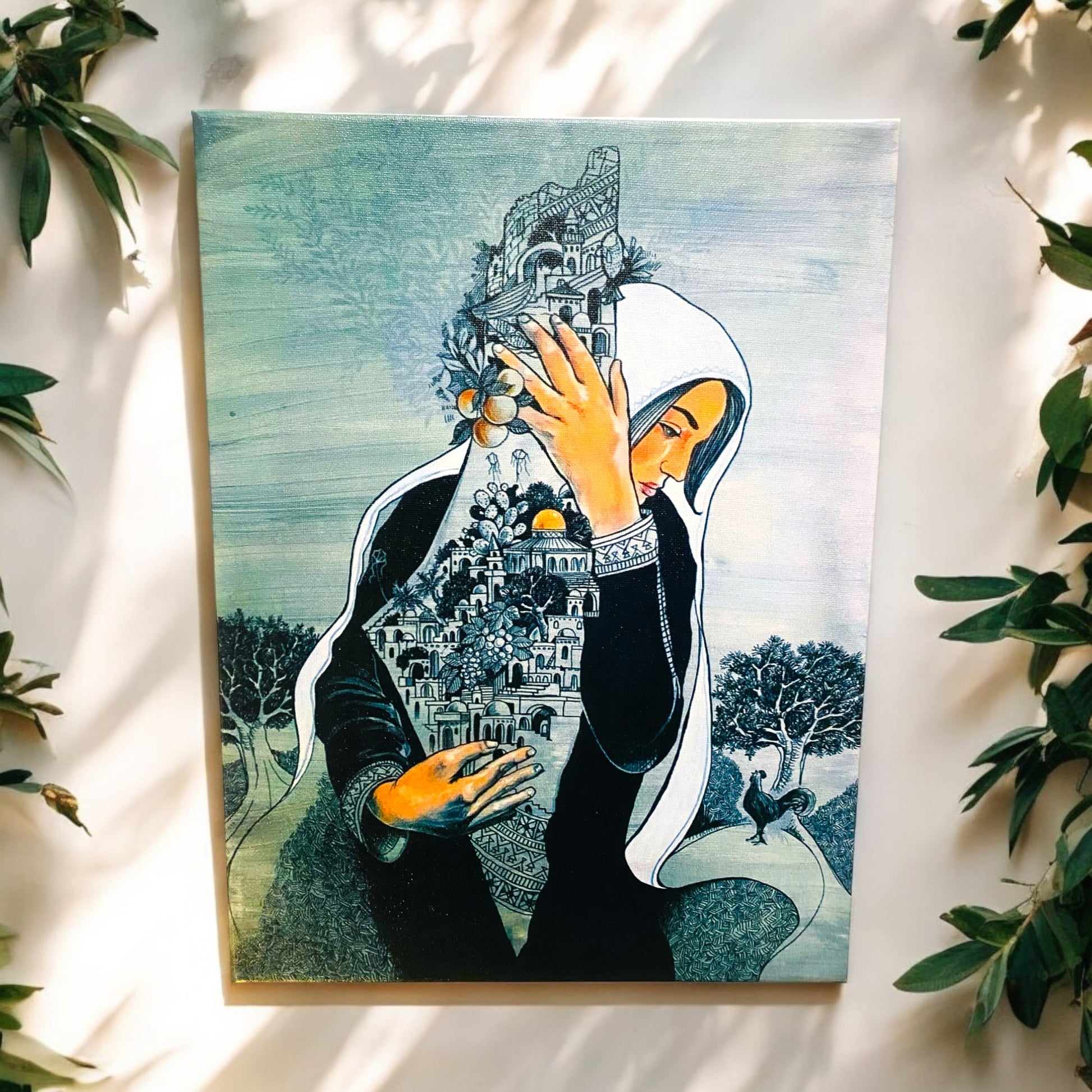 Printed on high-quality 12x16-inch canvas, it combines vibrant colors and intricate details to bring life and meaning to any space. Whether displayed in your living room, office, or a special corner of your home, this artwork is a timeless tribute to the resilience and spirit of Palestine.