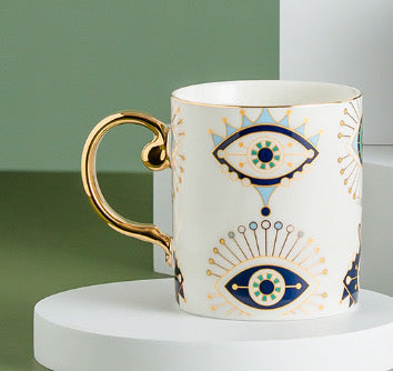 Unique Blue Eye Design: Adorned with a mesmerizing blue eye encircled by intricate hearts, this mug is a visual delight that adds a touch of elegance to your daily routine.